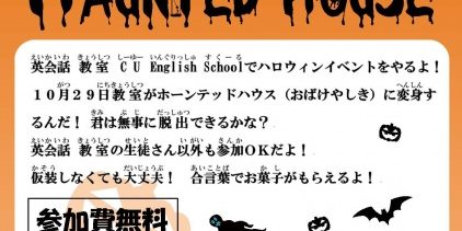10月222016キャンペーン情報教室ブログ2016年10月29日土曜日 午後2時から5時まで 英会話教室がホーンテッドハウス(おばけやしき)になるよ 参加費無料 お菓子ももらえるよ みんな来てね! Categories: キャンペーン情報, 教室ブログ2016年10月22日Post navigationPreviousPrevious post:英検Jr.好成績者の生徒さんNextNext post:2016-17年 年末年始の営業Related posts英会話教室CU English School 町屋校 開校します2019年7月14日当スクールオリジナル通貨 『CU English School Dollar』2018年3月20日入会時に選べるかわいいノート2018年3月20日【多読】始めました!2018年3月19日★★ 英検二次試験 体験談 ★★2018年2月26日『CU English School』のレベルチェックテスト2018年2月19日